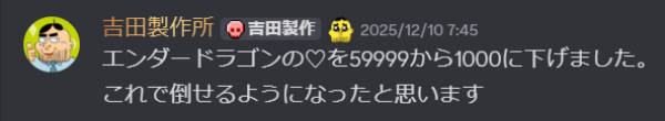 2025/12/10時点で エンダードラゴンの体力が59999から1000にまでに弱体化した旨、アナウンスがありました。
